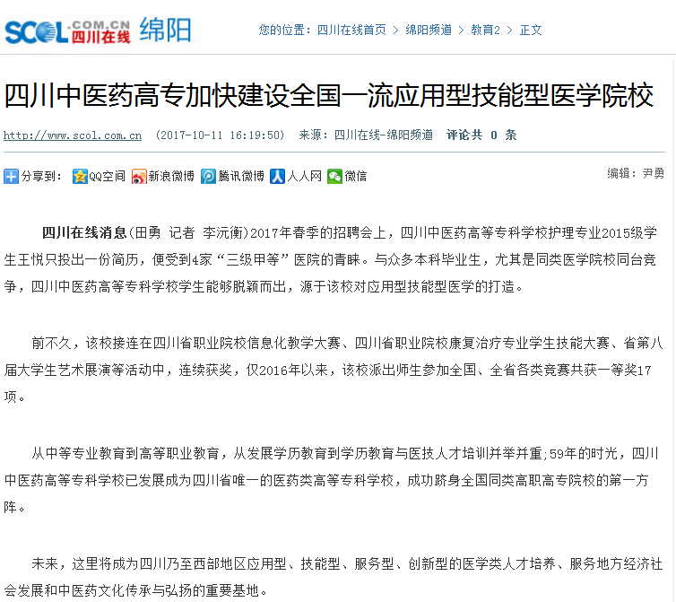 四川在线消息(田勇 记者 李沅衡)2017年春季的招聘会上,四川中医药高等专科学校护理专业2015级学生王悦只投出一份简历,便受到4家“三级甲等”医院的青睐。与众多本科毕业生,尤其是同类医学院校同台竞争,四川中医药高等专科学校学生能够脱颖而出,源于该校对应用型技能型医学高校的打造。