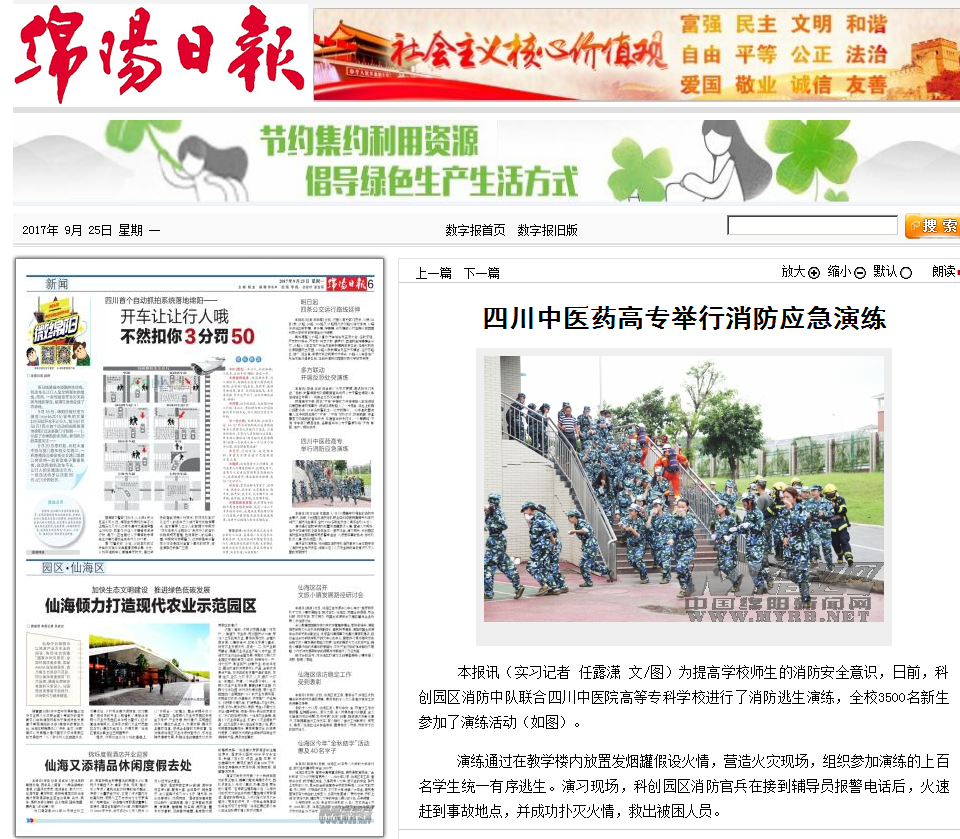 本报讯(实习记者 任露潇 文/图)为提高学校师生的消防安全意识,日前,科创园区消防中队联合四川中医院高等专科学校进行了消防逃生演练,全校3500名新生参加了演练活动(如图)。