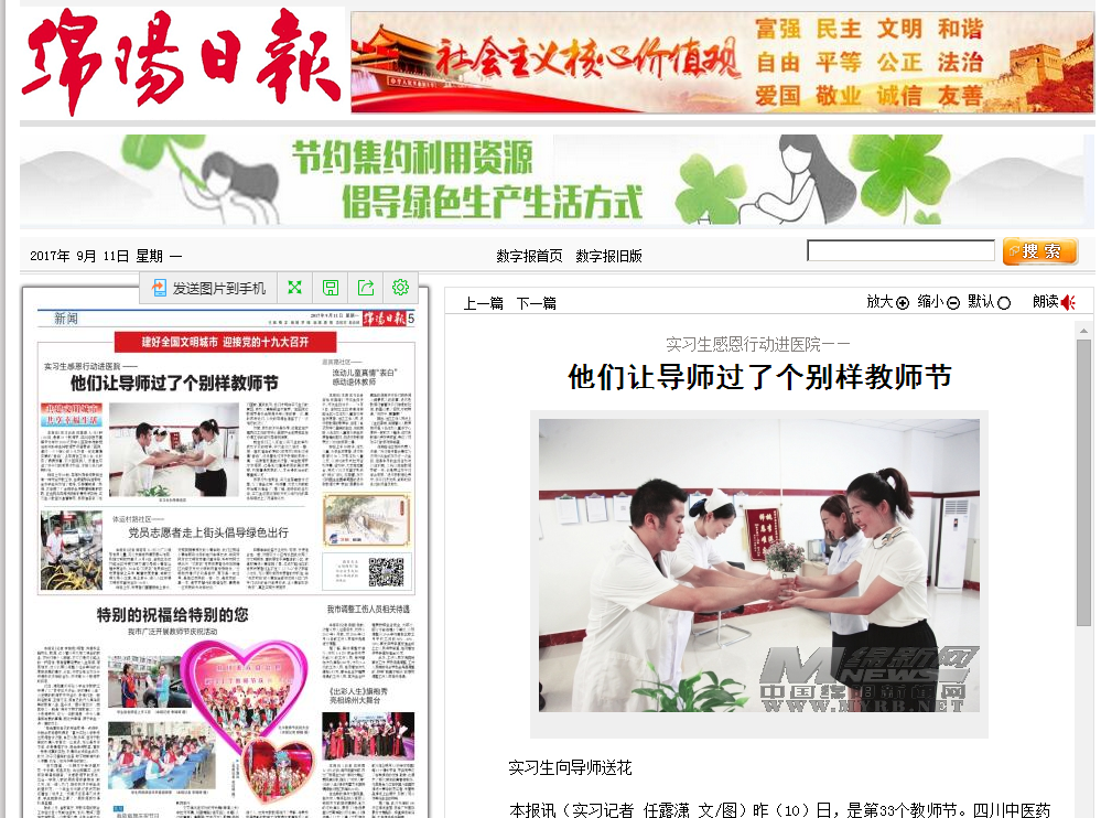 本报讯(实习记者 任露潇 文/图)昨(10)日,是第33个教师节。四川中医药高等专科学校2016级市中心医院学徒制班临床实践学生将教师节祝福带进了医院,通过一个个暖心的小礼物和一句句真情实意的“告白”,让导师在工作之余,也收获了满满惊喜。不少医院病人、家属在见证了孩子们的感恩行动后,不禁为他们点赞叫好。