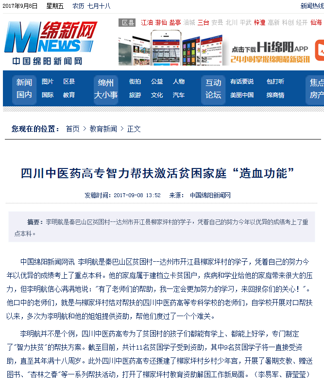 中国绵阳新闻网讯 李明航是秦巴山区贫困村--达州市开江县柳家坪村的学子,凭着自己的努力今年以优异的成绩考上了重点本科。他的家庭属于建档立卡贫困户,疾病和学业给他的家庭带来很大的压力,但李明航信心满满地说:"有了老师们的帮助,我一定会更加努力的学习,来回报你们的关心!"。他口中的老师们,就是与柳家坪村结对帮扶的四川中医药高等专科学校的老师们,自学校开展对口帮扶以来,多次为李明航和他的姐姐提供资助,帮他们度过了一个个难关。