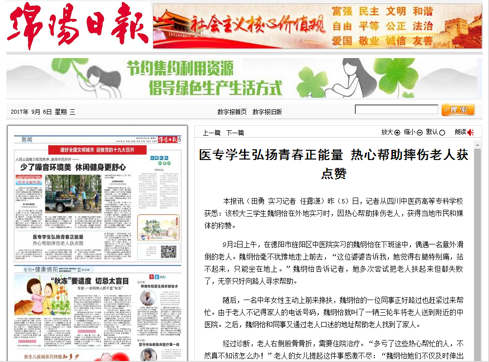 本报讯(田勇 实习记者 任露潇)昨(5)日,记者从四川中医药高等专科学校获悉:该校大三学生魏纲怡在外地实习时,因热心帮助摔伤老人,获得当地市民和媒体的称赞。