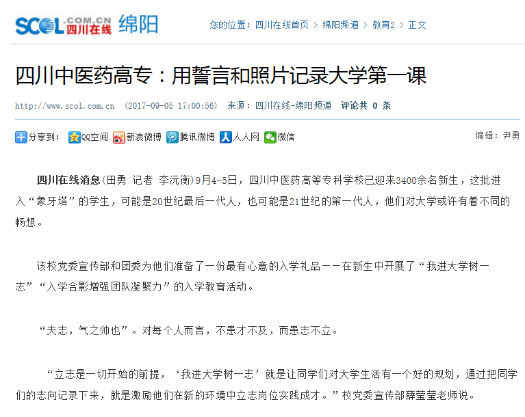 四川在线消息(田勇 记者 李沅衡)9月4-5日,四川中医药高等专科学校已迎来3400余名新生,这批进入“象牙塔”的学生,可能是20世纪最后一代人,也可能是21世纪的第一代人,他们对大学或许有着不同的畅想。
