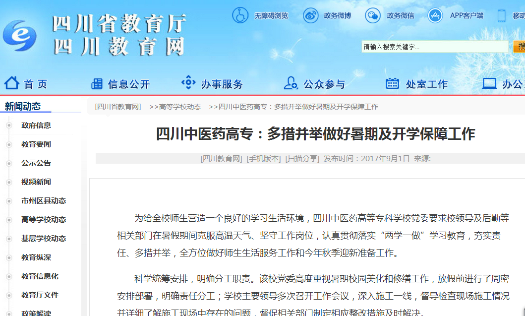 为给全校师生营造一个良好的学习生活环境,四川中医药高等专科学校党委要求校领导及后勤等相关部门在暑假期间克服高温天气、坚守工作岗位,认真贯彻落实“两学一做”学习教育,夯实责任、多措并举,全方位做好师生生活服务工作和今年秋季迎新准备工作。