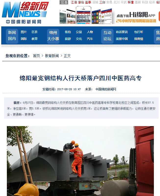 四川中医药高专建校近60年来,已发展成为一所初具规模、全省唯一的医学类高等专科学校,占地面积840余亩,在职教职工570人,在校学生1.3万人。教育中路是科技城城市规划的主干道,横穿学校南校区和北校区,师生因工作、学习、生活需频繁穿越该条公路,车辆通行给全校师生带来较大安全隐患。在市委、市政府的关心和市教育投资发展公司的大力支持下, 8月26日南北校区之间人行天桥开始进行主体安装,并实施桥面附属工程施工,预计9月10日正式投入使用。(薛莹莹 唐宝)
