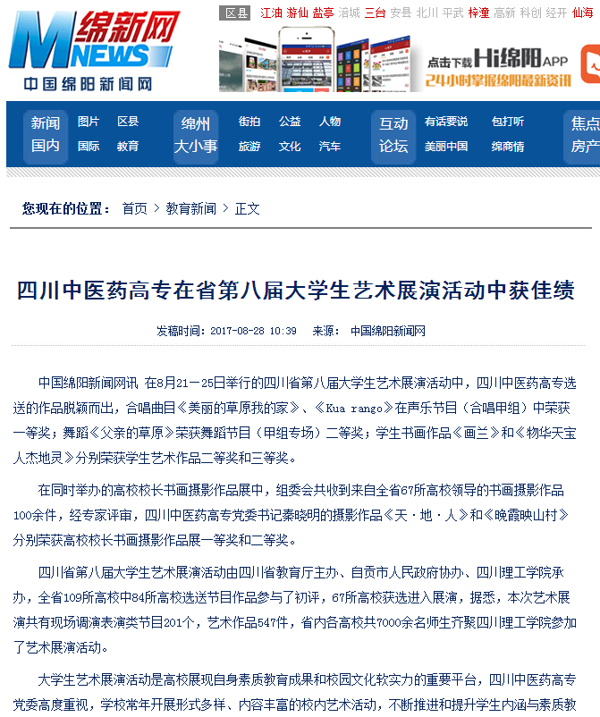 中国绵阳新闻网讯 在8月21—25日举行的四川省第八届大学生艺术展演活动中,四川中医药高专选送的作品脱颖而出,合唱曲目《美丽的草原我的家》、《Kua rango》在声乐节目(合唱甲组)中荣获一等奖;舞蹈《父亲的草原》荣获舞蹈节目(甲组专场)二等奖;学生书画作品《画兰》和《物华天宝 人杰地灵》分别荣获学生艺术作品二等奖和三等奖。