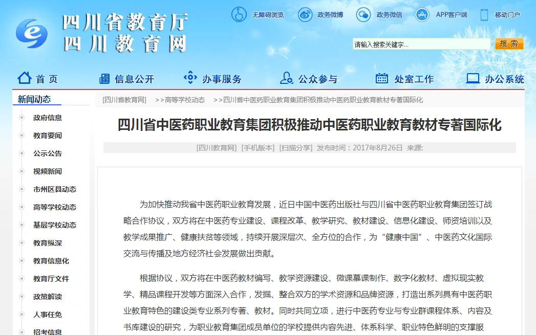 为加快推动我省中医药职业教育发展,近日中国中医药出版社与四川省中医药职业教育集团签订战略合作协议,双方将在中医药专业建设、课程改革、教学研究、教材建设、信息化建设、师资培训以及教学成果推广、健康扶贫等领域,持续开展深层次、全方位的合作,为“健康中国”、中医药文化国际交流与传播及地方经济社会发展做出贡献。