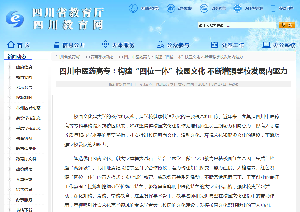 打造鲜明形象文化。充分挖掘地域文化的精髓,结合学校的历史积淀与特色,总结凝练出师生认同的学校核心价值理念体系,包括“德馨、技精、博学、笃行”的校训和反映历史传承与办学理念的校歌;重点打造集教学、科研、旅游等为一体的校园大型药用植物园;完善校内外联动的文化传播渠道,建成川内首个“四川中医药文化传承与研究中心”,开发系列中医药文化用品、文化产品;推动传统媒体和校园网、“两微一端”等新媒体融合互动,营造健康向上的网络文化氛围并惠及到每一位师生;加强与主流媒体的合作,塑造学校良好形象。