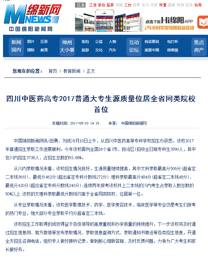 中国绵阳新闻网讯(田勇、刘成)8月10日上午,从四川中医药高等专科学校招生办获悉,该校2017年普通招生录取工作进展顺利。今年该校面向全国16个省(市、自治区)招收全日制专科生3990人,其中在川内招生3738人、占招生总数的93.68%。