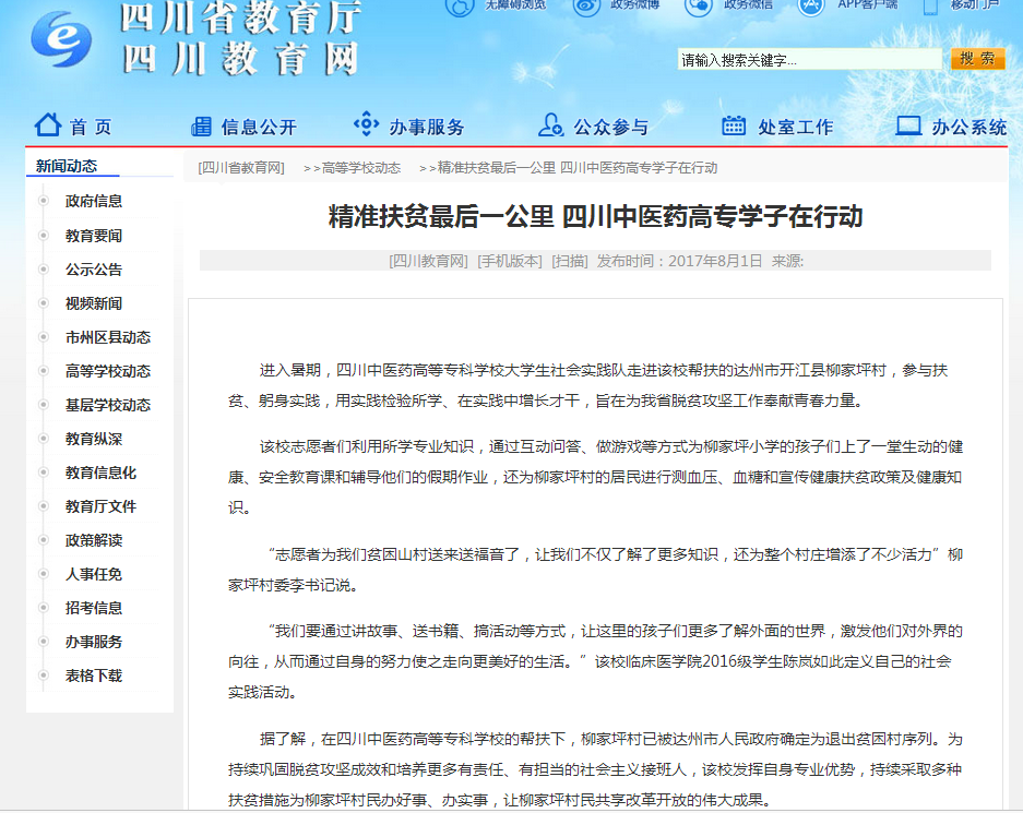 进入暑期,四川中医药高等专科学校大学生社会实践队走进该校帮扶的达州市开江县柳家坪村,参与扶贫、躬身实践,用实践检验所学、在实践中增长才干,旨在为我省脱贫攻坚工作奉献青春力量。