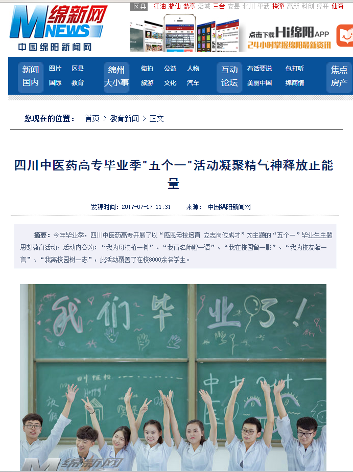 本次毕业生“五个一”感恩教育活动自6月开展以来,在四川中医药高专掀起了爱校感恩、团结奋进、铭志成才的热潮,成为凝聚精气神,释放正能量的良好途径,体现出该校学生将个人成长过程和学校发展历史相结合,感恩母校培育之情,争做学校历史文化传播者的良好风貌。