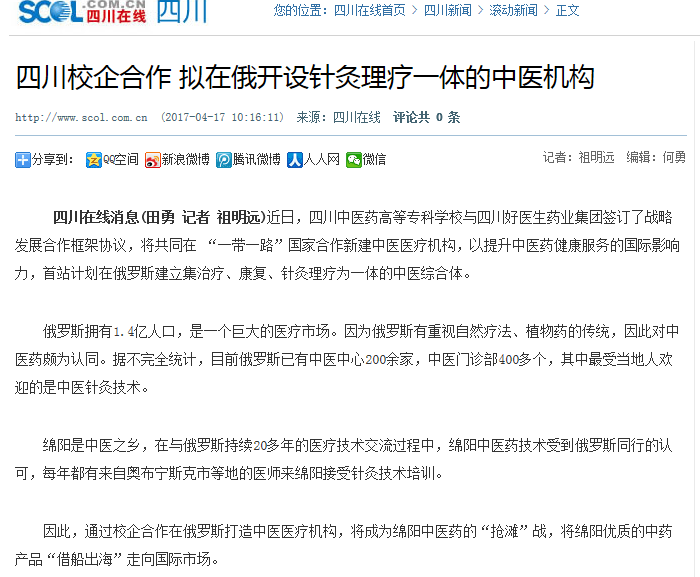 四川在线消息(田勇 记者 祖明远)近日,四川中医药高等专科学校与四川好医生药业集团签订了战略发展合作框架协议,将共同在 “一带一路”国家合作新建中医医疗机构,以提升中医药健康服务的国际影响力,首站计划在俄罗斯建立集治疗、康复、针灸理疗为一体的中医综合体。