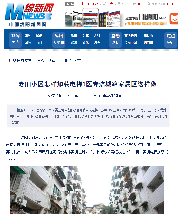 医专涪城路家属区相关负责人介绍,家属区位于涪城路183号,小区房屋建成于2000年前后,房屋为7-8层砖混结构,居住人群以卫校离退休职工为主,老年人住户较多,对增设电梯有较迫切的需求,此次安装电梯的是两栋小区将70余户住户,年龄最长者超过90岁,最小的也有六十岁多岁,绝大部分都是离退休老年人。《实施意见》出台后,小区部分热心公益事业的业主先后多次到市住建局咨询相关政策,在小区业主的齐心协力下,小区严格按照《实施意见》要求的程序组织实施,历时半年,共两栋楼四个单元完成了业主意见征求、资金筹集、设计审图、规划消防审查、施工许可办理等程序,目前正式进入施工阶段,预计6月底完成施工并投入使用。