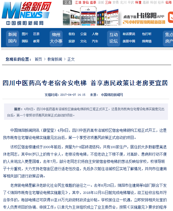 中国绵阳新闻网讯(薛莹莹)4月6日,四川中医药高专涪城校区宿舍电梯钢构工程正式开工,这是我市既有住宅增设电梯实施意见出台后,第一个享受该项惠民政策正式启动的项目。