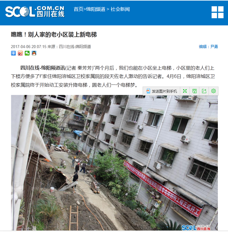 四川在线-绵阳频道讯(记者 秦芳芳)“两个月后,我们也能在小区坐上电梯,小区里的老人们上下楼方便多了!”家住绵阳涪城区卫校家属院的段天佐老人激动的告诉记者。4月6日,绵阳涪城区卫校家属院终于开始动工安装升降电梯,圆老人们一个电梯梦。
