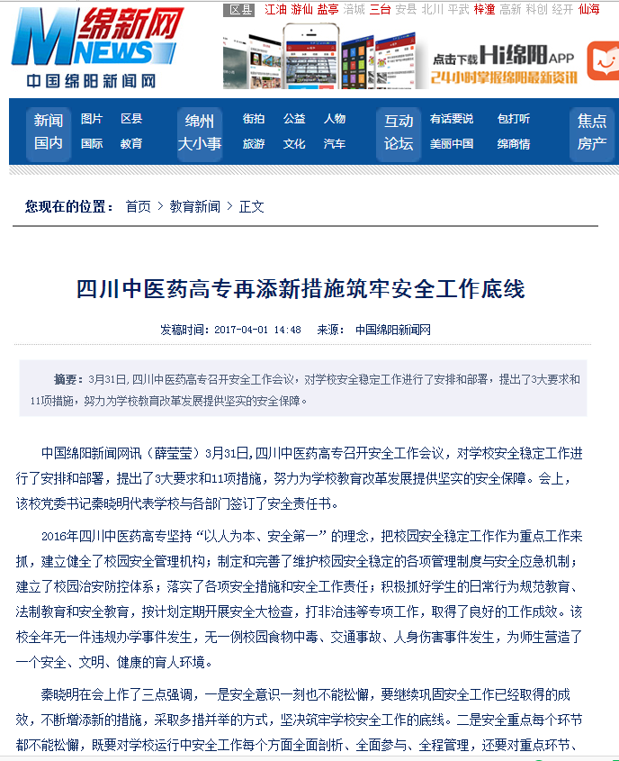 中国绵阳新闻网讯(薛莹莹)3月31日,四川中医药高专召开安全工作会议,对学校安全稳定工作进行了安排和部署,提出了3大要求和11项措施,努力为学校教育改革发展提供坚实的安全保障。会上,该校党委书记秦晓明代表学校与各部门签订了安全责任书。