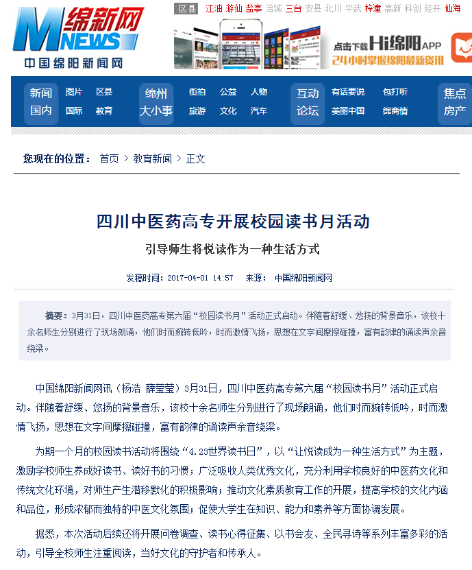 中国绵阳新闻网讯(杨浩 薛莹莹)3月31日,四川中医药高专第六届“校园读书月”活动正式启动。伴随着舒缓、悠扬的背景音乐,该校十余名师生分别进行了现场朗诵,他们时而婉转低吟,时而激情飞扬,思想在文字间摩擦碰撞,富有韵律的诵读声余音绕梁。