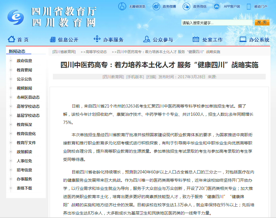 目前四川省老龄化持续增长,预测到2040年60岁以上人口占全省总人口的三分之一,对包括医疗在内的健康服务业发展带来巨大挑战。作为四川唯一的医药类高等专科学校,近年来该校始终坚持开门开放办学,以行业需求和毕业生就业为导向,服务于大众创业与万众创新,开设了20门医药类相关专业;加大推进医药类职业教育本土化,培育出更多更好的高素质技能型人才,致力于服务“健康四川”“健康绵阳”战略的实施和地方经济社会的发展。目前该校在校学生达1.3万余人,就业率保持在95%以上;先后培养出毕业生达8万余人,大多数成长为基层卫生和民族地区医药类的一线骨干力量。
