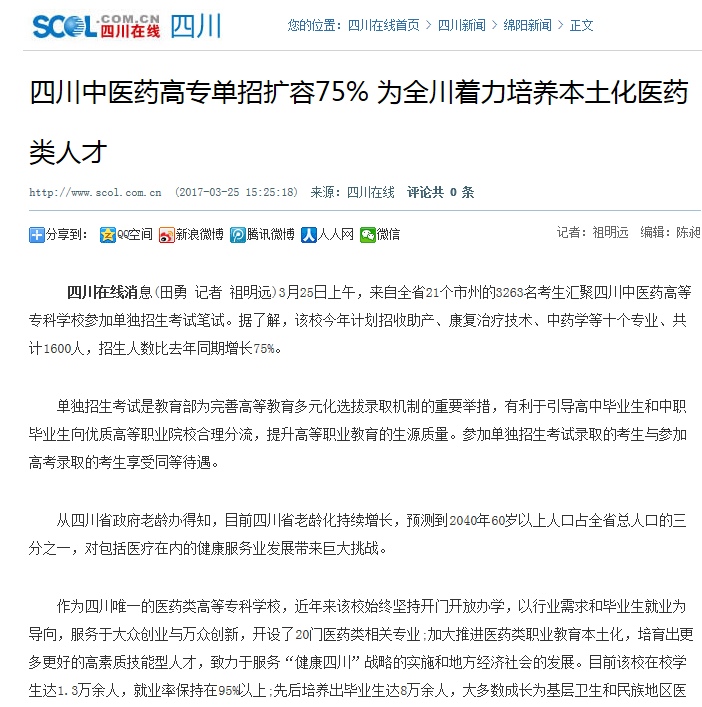 作为四川唯一的医药类高等专科学校,近年来该校始终坚持开门开放办学,以行业需求和毕业生就业为导向,服务于大众创业与万众创新,开设了20门医药类相关专业;加大推进医药类职业教育本土化,培育出更多更好的高素质技能型人才,致力于服务“健康四川”战略的实施和地方经济社会的发展。目前该校在校学生达1.3万余人,就业率保持在95%以上;先后培养出毕业生达8万余人,大多数成长为基层卫生和民族地区医药类的一线骨干力量。