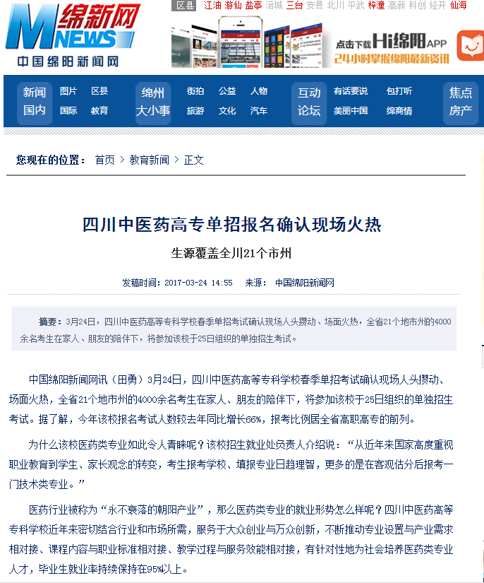 中国绵阳新闻网讯(田勇)3月24日,四川中医药高等专科学校春季单招考试确认现场人头攒动、场面火热,全省21个地市州的4000余名考生在家人、朋友的陪伴下,将参加该校于25日组织的单独招生考试。据了解,今年该校报名考试人数较去年同比增长66%,报考比例居全省高职高专的前列。