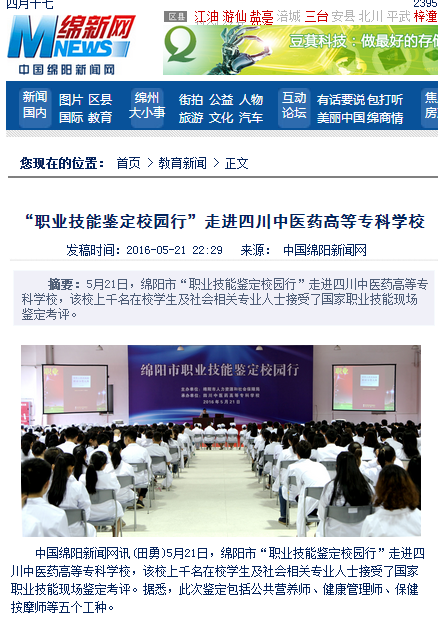 中国绵阳新闻网讯(田勇)5月21日,绵阳市“职业技能鉴定校园行”走进四川中医药高等专科学校,该校上千名在校学生及社会相关专业人士接受了国家职业技能现场鉴定考评。据悉,此次鉴定包括公共营养师、健康管理师、保健按摩师等五个工种。
