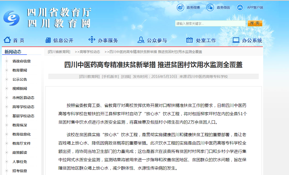该校在贫困县实施“放心水”饮水工程,是贯彻实施健康四川和健康扶贫工程的重要部署,是让老百姓喝上放心水、降低因病致贫概率的重要举措。此次饮水工程的实施是由四川中医药高等专科学校全额出资,将协同当地卫生部门的力量完成;这也是首次在该县所有贫困村村民家门口和乡村小学进行集中拉网式水质安全监测,监测结果将被用来进一步指导和改善贫困地区、贫困群众的饮水问题,旨在保障贫困地区群众喝上放心水,减少群体性、水源性传染病的发生。