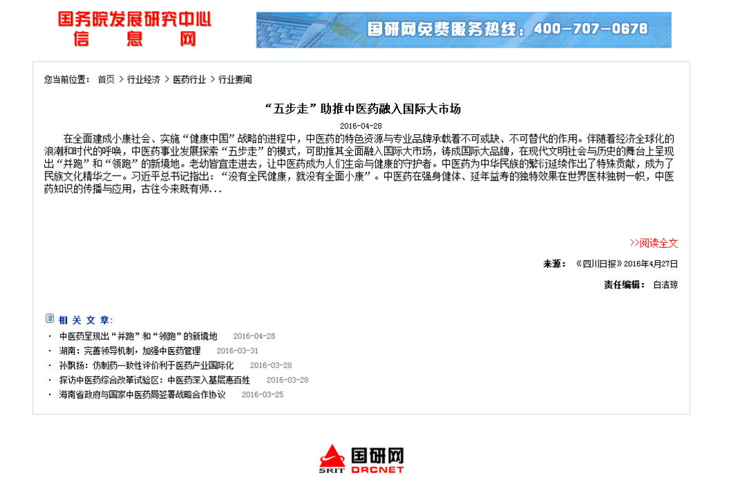 在全面建成小康社会、实施“健康中国”战略的进程中,中医药的特色资源与专业品牌承载着不可或缺、不可替代的作用。伴随着经济全球化的浪潮和时代的呼唤,中医药事业发展探索“五步走”的模式,可助推其全面融入国际大市场,铸成国际大品牌,在现代文明社会与历史的舞台上呈现出“并跑”和“领跑”的新境地。