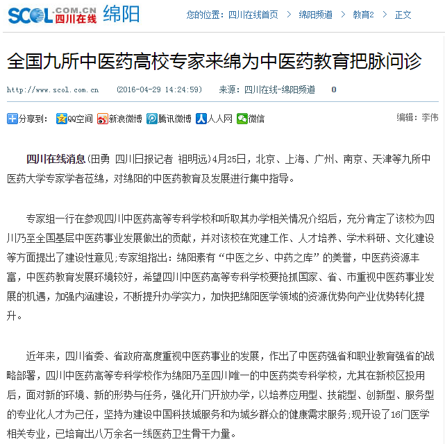 四川在线消息(田勇 四川日报记者 祖明远)4月25日,北京、上海、广州、南京、天津等九所中医药大学专家学者莅绵,对绵阳的中医药教育及发展进行集中指导。