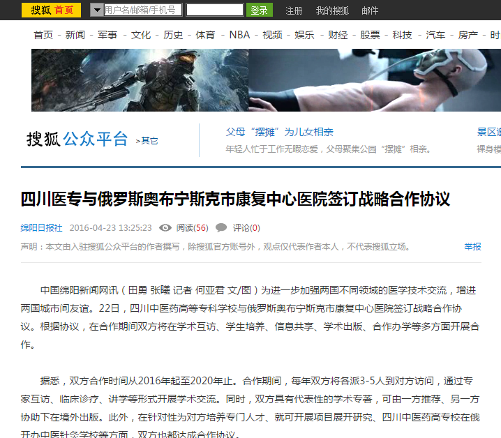 中国绵阳新闻网讯(田勇 张曦 记者 何亚君 文/图)为进一步加强两国不同领域的医学技术交流,增进两国城市间友谊。22日,四川中医药高等专科学校与俄罗斯奥布宁斯克市康复中心医院签订战略合作协议。根据协议,在合作期间双方将在学术互访、学生培养、信息共享、学术出版、合作办学等多方面开展合作。
