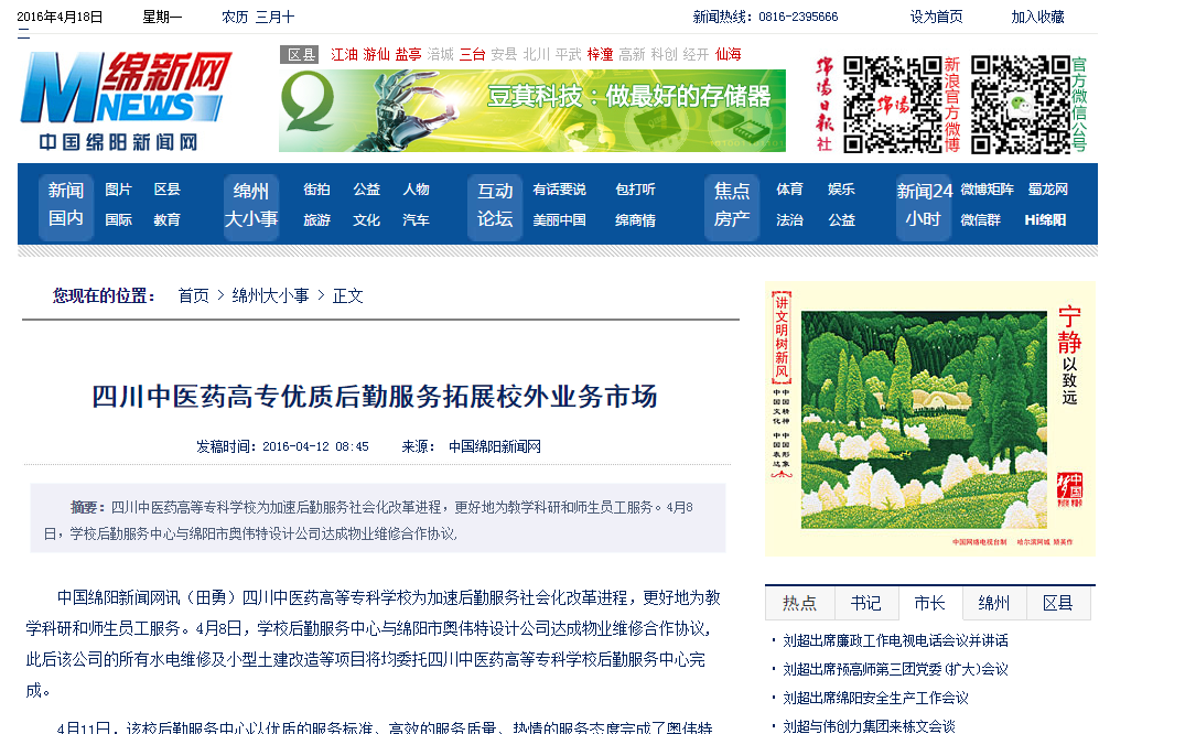 上一篇: 绵阳新闻网:四川中医药高专获"全省高校学生公寓管理工作先进集体"