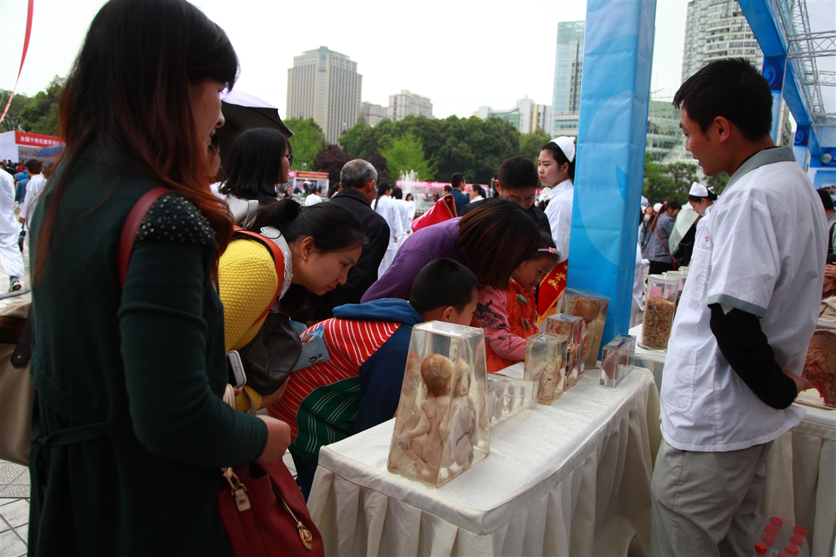 “这是健康人的肺,那是长期吸烟者的肺,从直观上就能看出吸烟对我们身体的危害。”今日上午9时许,四川中医药高专医学基础部副教授赵江波,正在为市民讲解人体生物标本知识。据介绍,今天在现场共展示了包括心肺、消化系统、呼吸系统等在内的60余件人体生物标本。而通过真实的标本展示,让参观者更加直观的了解人体胚胎发育及各系统的概貌、健康与疾病器官的异同。同时,医学专家的现场讲解,也为市民普及了全面的健康保健常识。