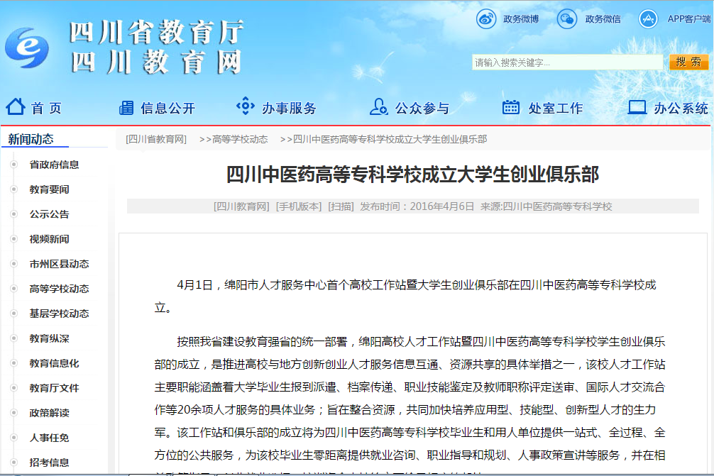 4月1日,绵阳市人才服务中心首个高校工作站暨大学生创业俱乐部在四川中医药高等专科学校成立。