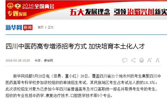 新华网成都3月28日电(田勇、董小红)26日,覆盖四川省21个地市州的考生集聚四川中医药高等专科学校参加该校组织的单独招生考试,其民族地区考生占考试总人数的18.8%;此次该校招生对象为已参加今年四川省普通高考及对口高职统一报名并取得考生号的考生,招收的专业包括中药学、康复治疗技术、口腔医学技术等5个专业。