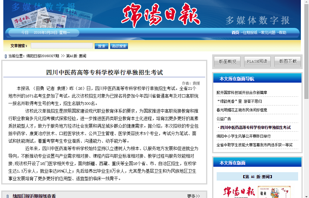 本报讯 (田勇 记者 袁媛)昨(26)日,四川中医药高等专科学校举行单独招生考试。全省21个地市州的1671名考生参加了考试。此次该校招生对象为已报名将参加今年四川省普通高考及对口高职统一报名并取得考生号的考生,招生名额为300名。