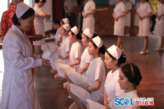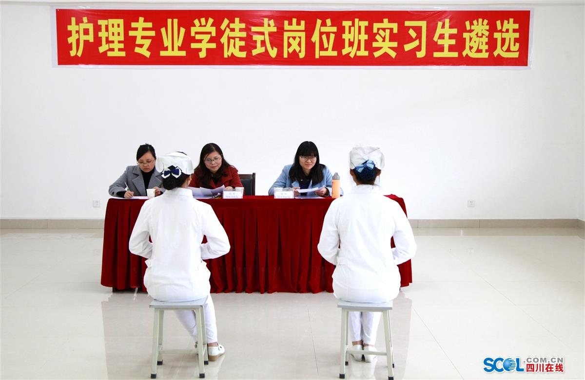 四川在线消息(田勇 四川日报记者 祖明远 文/图)3月11日,四川中医药高等专科学校在全国率先探索开展的护理专业学徒式岗位班开始遴选第二批学员,绵阳市中心医院、绵阳市三医院、绵阳四0四医院、绵阳市中医医院等市内教学或附属医院纷纷前来招选;此次共招选学生150名。