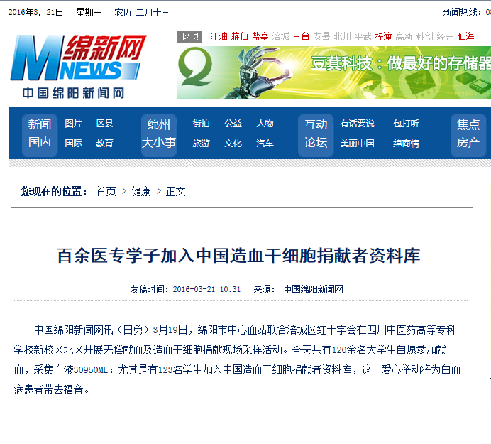 中国绵阳新闻网讯(田勇)3月19日,绵阳市中心血站联合涪城区红十字会在四川中医药高等专科学校新校区北区开展无偿献血及造血干细胞捐献现场采样活动。全天共有120余名大学生自愿参加献血,采集血液30950ML;尤其是有123名学生加入中国造血干细胞捐献者资料库,这一爱心举动将为白血病患者带去福音。