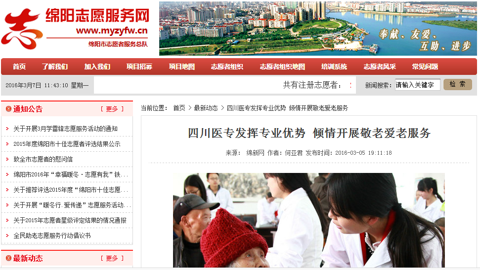 5日,时值学雷锋纪念日,四川中医药高等专科学校60余名中医、护理等专业的医学生来到我市青义镇敬老院开展敬老爱老志愿服务活动,给老人们带去了健康、关爱和温暖。