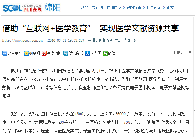四川在线消息(田勇 四川日报记者 祖明远)3月1日,绵阳市医学文献信息共享服务中心在四川中医药高等专科学校成立挂牌。此中心将依托该校新建的图书馆,借助“互联网+医学教育”,利用大数据、移动互联和云计算等信息化手段,向全校师生和社会各界提供电子图书阅读、电子文献查阅等服务。