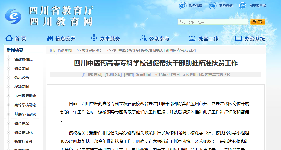 日前,四川中医药高等专科学校在该校两名扶贫挂职干部即将奔赴达州市开江县扶贫帮困岗位开展新的一年工作之时,该校领导专题听取了他们的工作汇报,并就后续深入推进此项工作进行细化和督促。