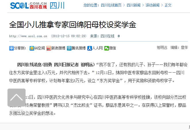 四川在线消息(田勇四川日报记者祖明远)“我不在了,还有我的儿子、孙子……我们每年都会往东方奖学金里注入5万元,并代代相传下去。”12月11日,绵阳中医专家廖品东回到母校——四川中医药高等专科学校,计划每年拿出5万元,设立“东方奖学金”,用于奖励和资助母校学子。