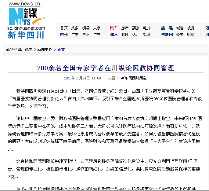 新华网四川频道11月24日电(田勇、本网记者董小红)近日,由四川中医药高等专科学校承办的“首届医教协同管理创新论坛”在四川绵阳举行,吸引了来自全国近60所医院260余位医院管理者和专家学者到场,交流学习。