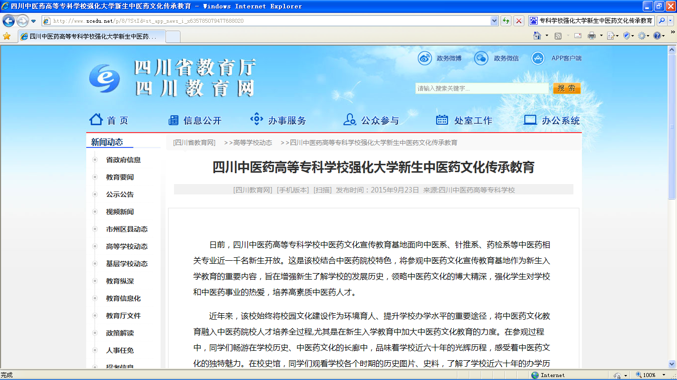 日前,四川中医药高等专科学校中医药文化宣传教育基地面向中医系、针推系、药检系等中医药相关专业近一千名新生开放。这是该校结合中医药院校特色,将参观中医药文化宣传教育基地作为新生入学教育的重要内容,旨在增强新生了解学校的发展历史,领略中医药文化的博大精深,强化学生对学校和中医药事业的热爱,培养高素质中医药人才。