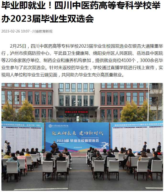 上一篇: 中国教育在线:毕业即就业!四川中医药高等专科学校举办2023届毕业生双选会