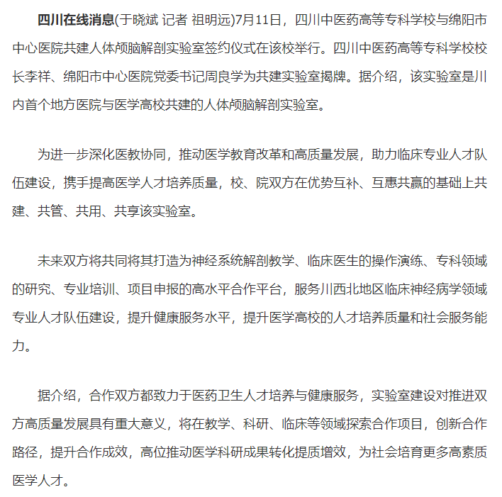下一篇: 今日头条:四川医专与绵阳市中心医院共建人体颅脑解剖实验室