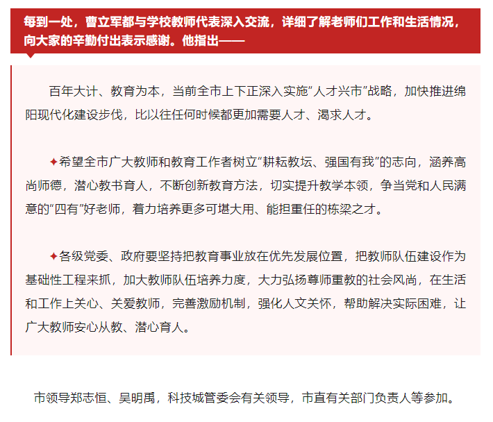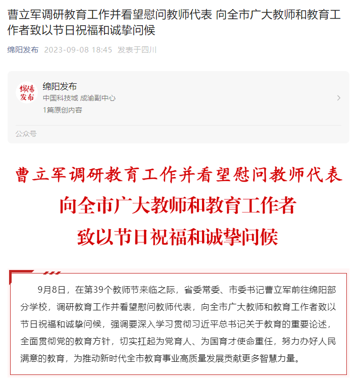 上一篇: 绵阳日报:曹立军调研教育工作并看望慰问教师代表 向全市广大教师和教育工作者致以节日祝福和诚挚问候