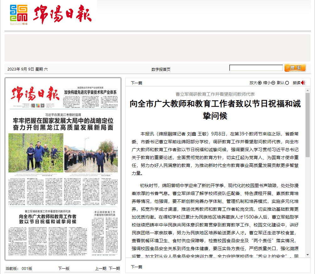 本报讯(绵报融媒记者 刘鑫 王敏)9月8日,在第39个教师节来临之际,省委常委、市委书记曹立军前往绵阳部分学校,调研教育工作并看望慰问教师代表,向全市广大教师和教育工作者致以节日祝福和诚挚问候,强调要深入学习贯彻习近平总书记关于教育的重要论述,全面贯彻党的教育方针,切实扛起为党育人、为国育才使命重任,努力办好人民满意的教育,为推动新时代全市教育事业高质量发展贡献更多智慧力量。