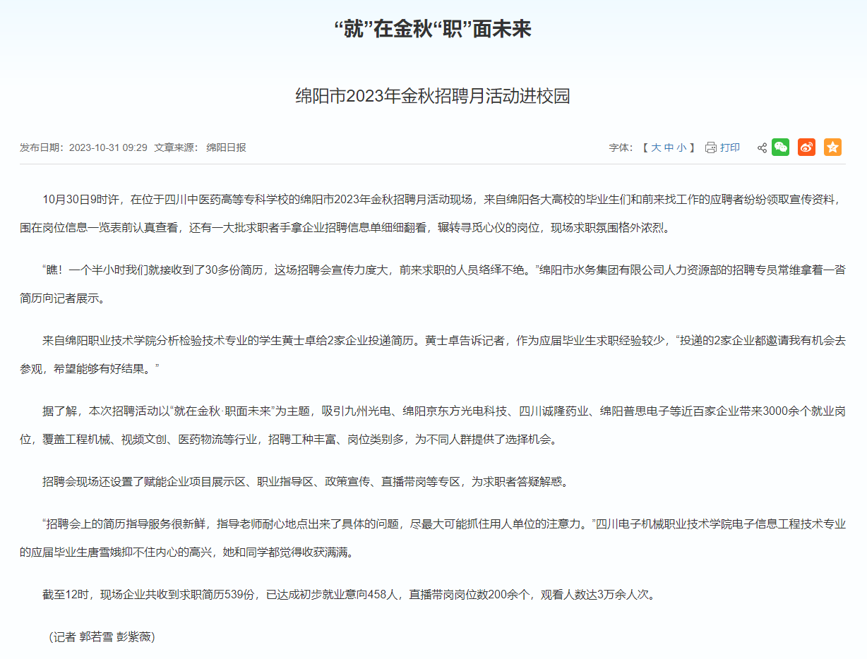 下一篇: 绵阳新闻网:“就”在金秋“职”面未来 绵阳市2023年金秋招聘月活动进校园