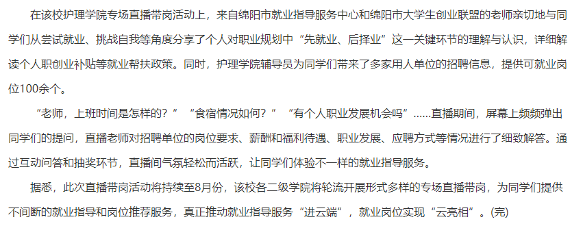 下一篇: 现代职教网:四川医专:就业服务进云端 直播带岗促就业