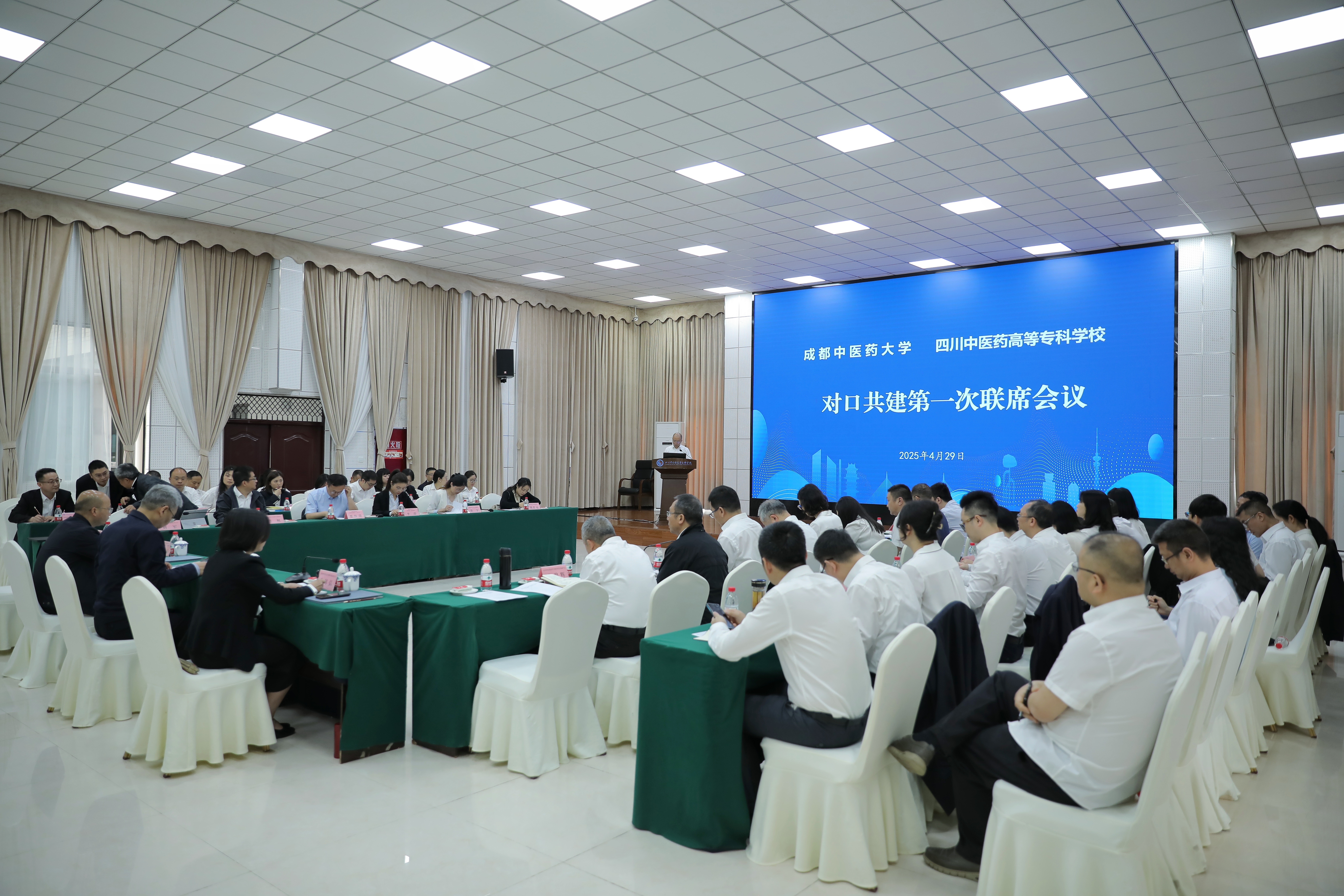 2025年4月29日,我校与成都中医药大学对口共建活动在南园综合楼举行。省委组织部干部五处副处长、二级调研员蔡鸿斌,成都中医药大学党委副书记、校长余曙光,绵阳市人民政府副市长王璐、副秘书长陈冬梅,市委组织部、市教体局、市卫健委相关领导,我校全体校领导及附属医院领导出席活动。两校相关职能部门负责人共同参与活动。