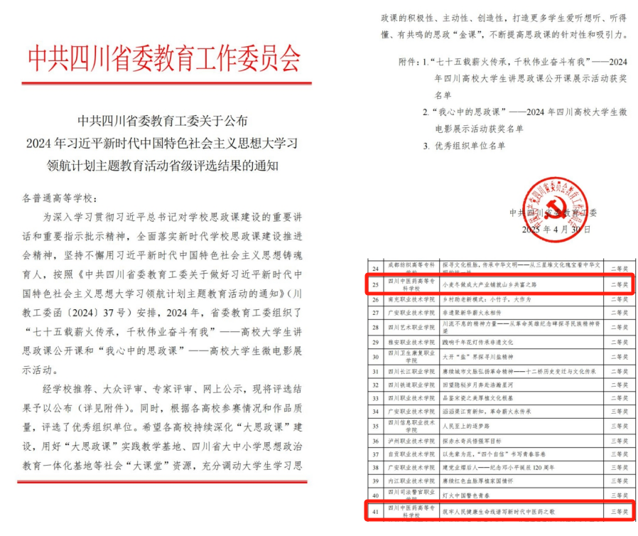 近日,中共四川省委教育工委公布了2024年习近平新时代中国特色社会主义思想大学习领航计划主题教育活动省级评选结果,我校两件作品脱颖而出,分获二等奖和三等奖。