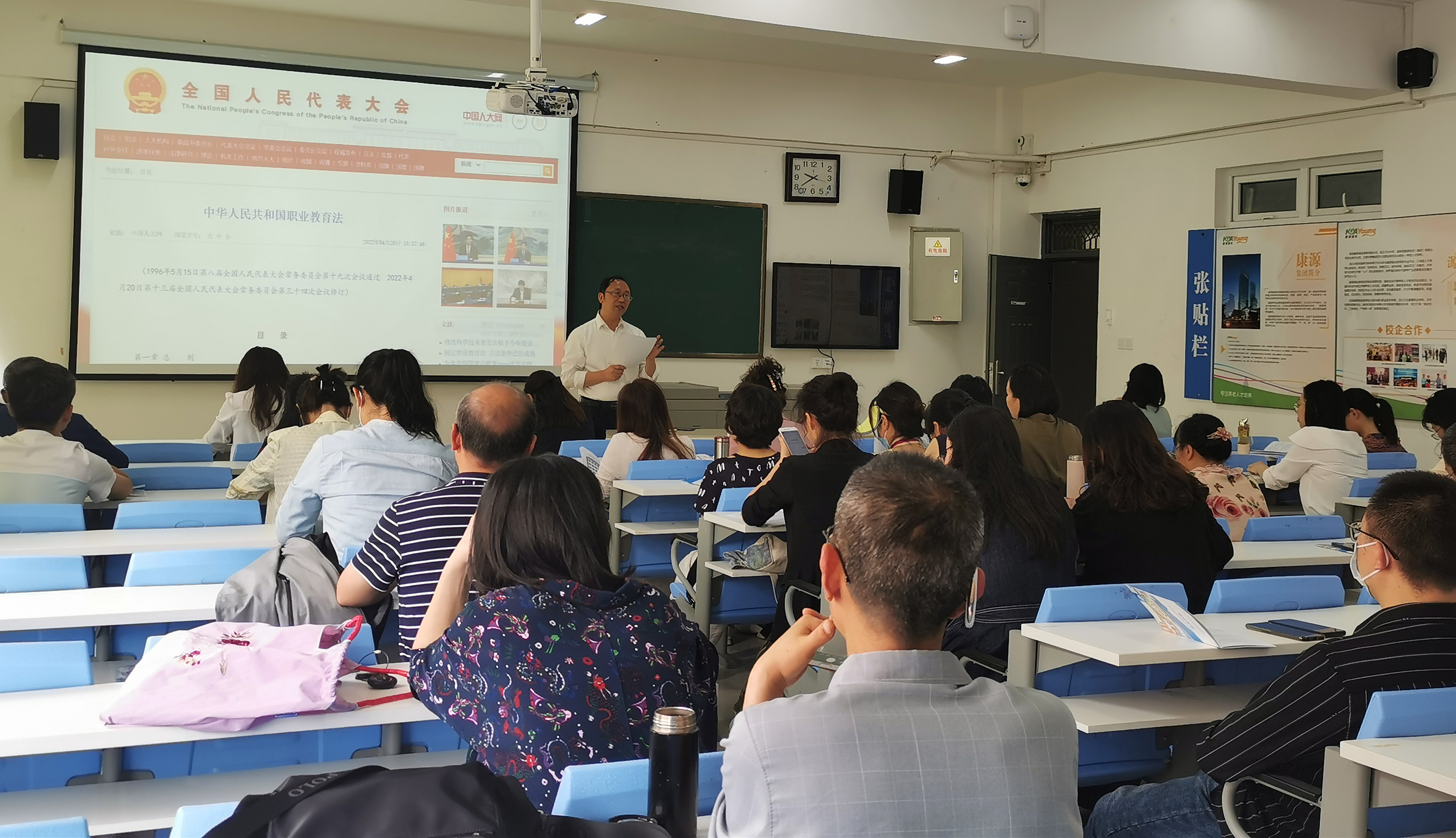 院长古仕明向大家解读了新修订《职业教育法》的发布背景,带领全院老师学习了新《职业教育法》的主要内容、重大意义和突出亮点,要求大家准确把握职业教育的发展规律,以学校“十四五”规划为导向,深化产教融合、校企合作,优化资源配置,奋力开创学校高质量内涵式发展的新局面。